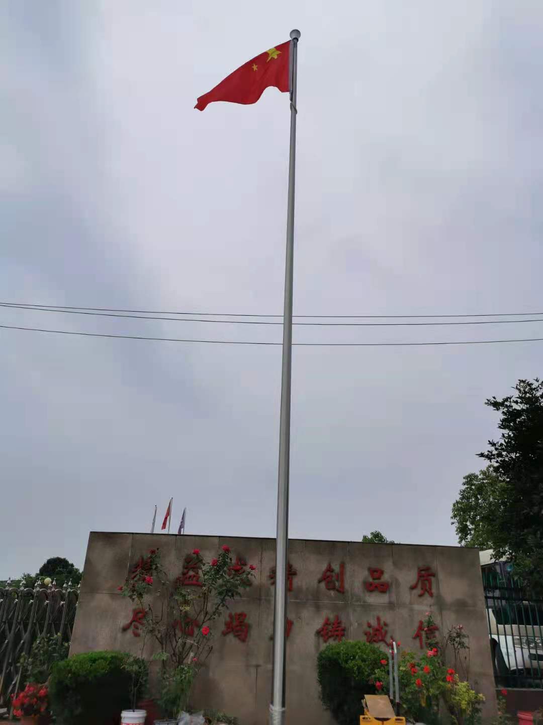 安徽佳樂建設機械有限公司新安裝1支12米不銹鋼錐形旗桿,此次左尚金屬安徽耀龍為安徽佳樂建設機械有限公司生產的旗桿為優質不銹鋼制造,旗桿錐形挺拔高大,是錐形外置式的旗桿,內藏不銹鋼繩,旗桿外無旗繩,免去旗桿與旗繩碰撞產生刮痕,從而可能導致桿體易生銹。