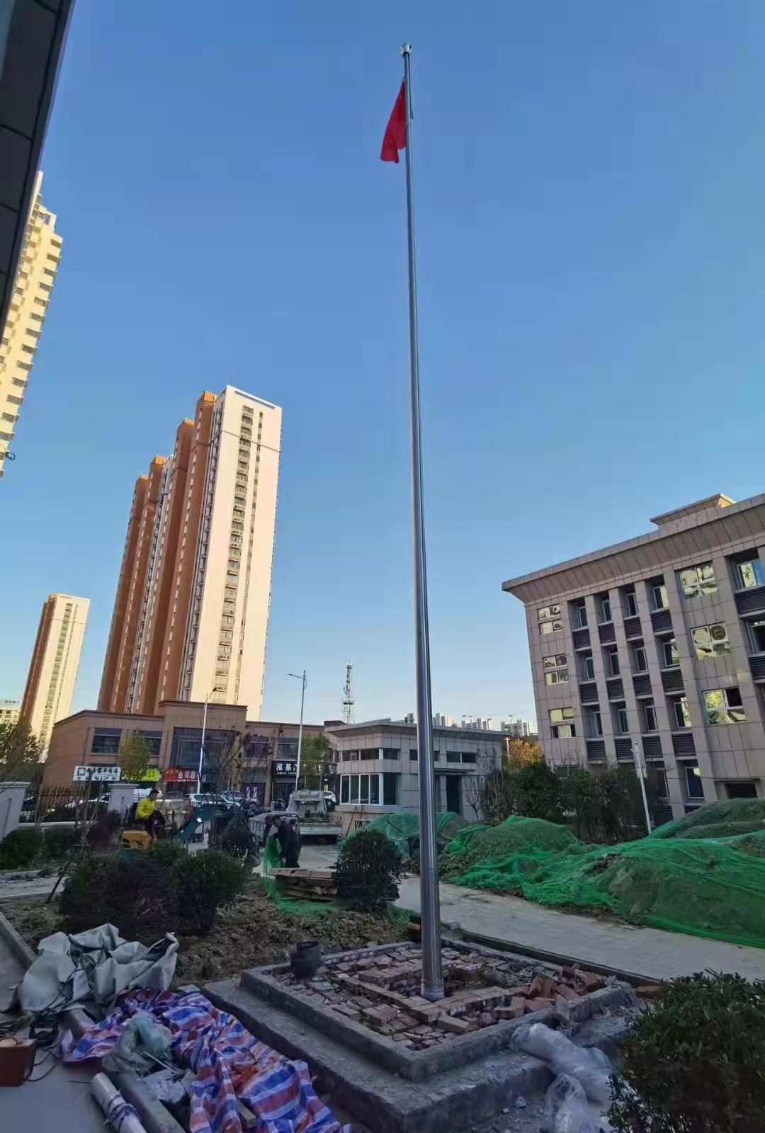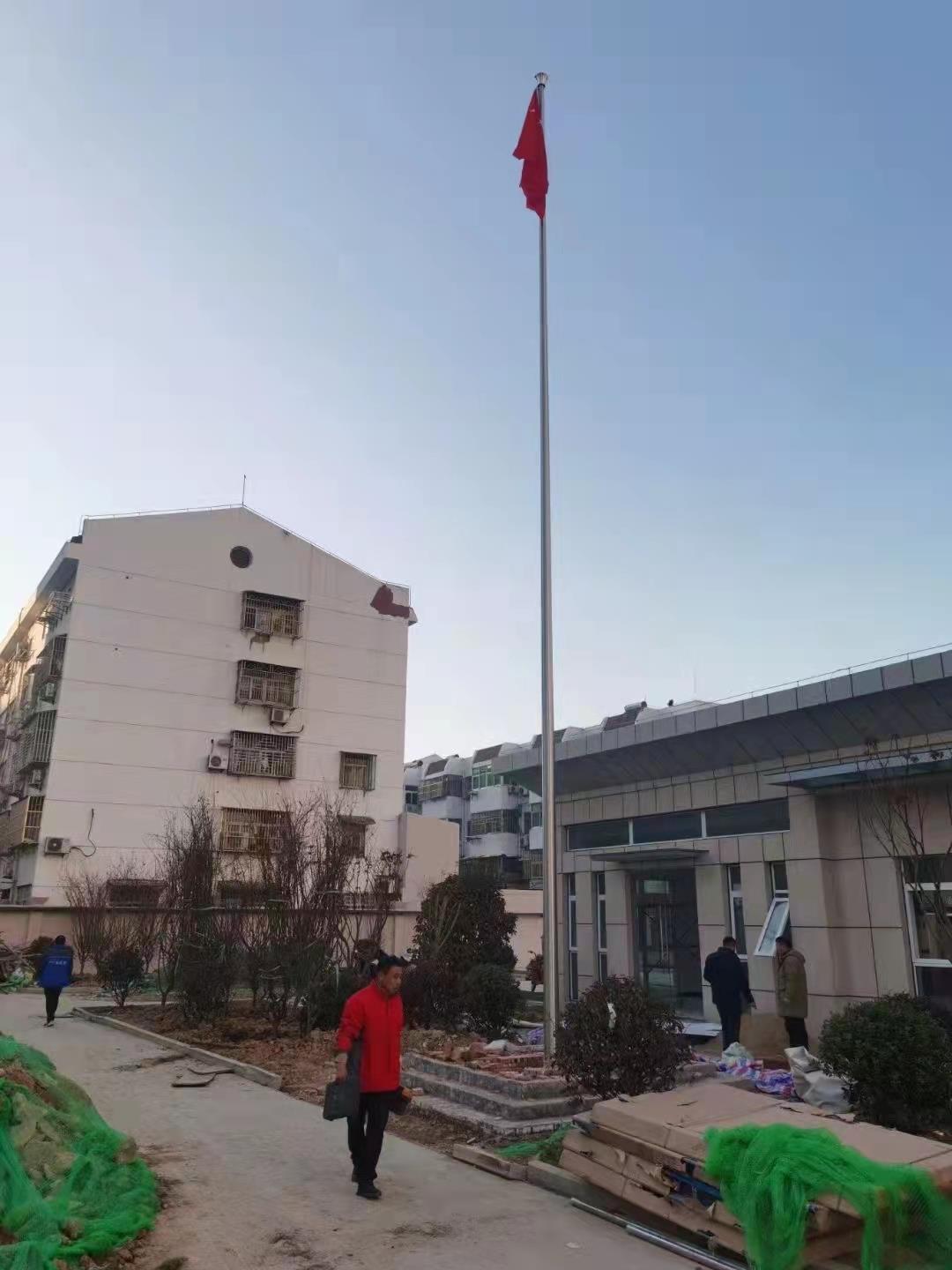 宿州市埇橋區三里灣派出所15米不銹鋼錐形旗桿,此次左尚金屬安徽耀龍為宿州市埇橋區三里灣派出所生產的旗桿為優質不銹鋼制造,旗桿錐形挺拔高大,是錐形外置式的旗桿,內藏不銹鋼繩,旗桿外無旗繩,免去旗桿與旗繩碰撞產生刮痕,從而可能導致桿體易生銹。